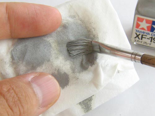 ドライブラシは塗料を筆先に少しつけて、その塗料の大部分をティッシュ等で拭き取り、筆を叩くようにして、カサカサと塗料を擦り付けるように塗装していく方法です。